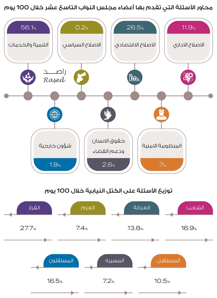 وفيما يتعلق بتحليل الأسئلة النيابية التي تم تقديمها تبين أن محور التنمية والخدمات حاز على 56,1%من الأسئلة التي تم تقديمها خلال الـ 100يوم الأولى، تلاه محور الإصلاح الاقتصادي بـ26,5%، ثم محور الإصلاح الإداري بـ 11,9%من مجموع الأسئلة ومحور حقوق الإنسان ودعم القضاء بـ 2,6%من مجموع الأسئلة.