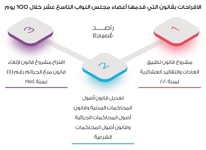 أما الأداء التشريعي فقد أقر مجلس النواب التاسع عشر خلال 100يوم 12قانوناً وقدم المجلس 3اقتراحات بقانون حول مشروع قانون تطبيق العادات والتقاليد العشائرية لسنة 2021، والاقتراح بقانون الثاني كان موضوعه تعديل قانون أصول المحاكمات المدنية وقانون أصول المحاكمات الجزائية وقانون أصول المحاكمات الشرعية، والاقتراح بقانون الثالث كان موضوعه اقتراح مشروع قانون لإلغاء قانون منع الجرائم رقم 7لسنة 1954.