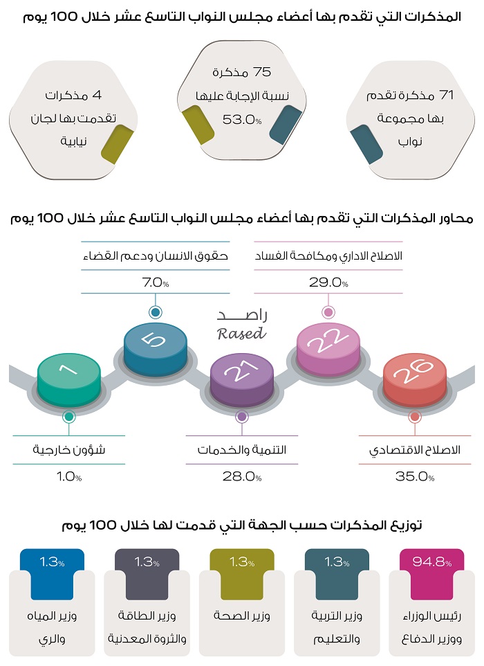 وقدم مجلس النواب خلال أول 100يوم 75مذكرة نيابية حيث قدمت 71مذكرة من مجموعة نواب، وقدمت 4مذكرات من قبل اللجان النيابية، ووجهت المذكرات لـ 5جهات مختلفة كان أعلاها رئيس الوزراء حيث وجه له 94,8%من مجموع المذكرات المقدمة، ووجهت مذكرة واحدة وبنسبة 1,3%من مجموع المذكرات لكل من وزير التربية والتعليم ووزير الصحة ووزير الطاقة ووزير المياه، يذكر أن نسبة الإجابة على المذكرات بلغت 53%.