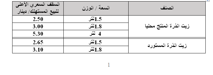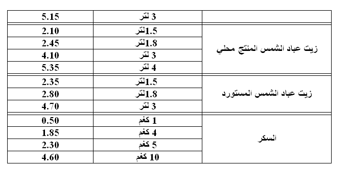 ويبين الجدول التالي السقوف السعرية لمادتي السكر والزيوت النباتية اعتبارا من صباح يوم غد الخميس.