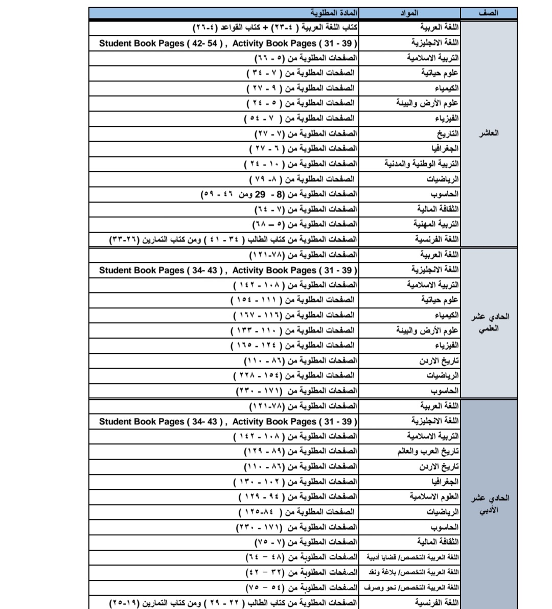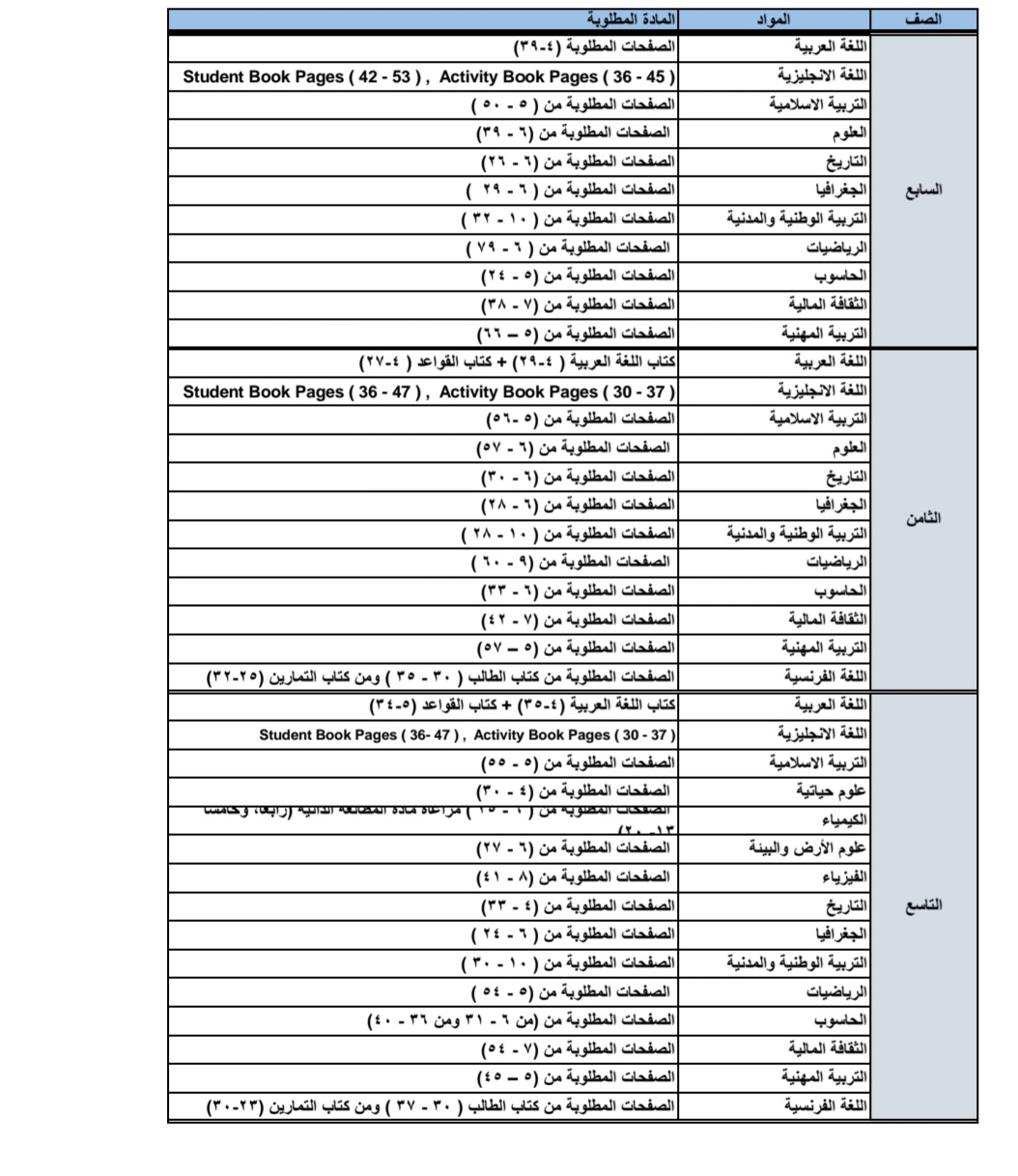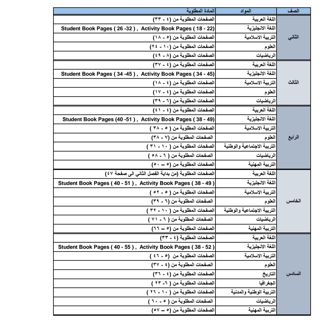 وبينت الوزارة أن بإمكان الطلبة الاطلاع على أرقام صفحات الكتاب المدرسي المطلوبة في التقييم الأول وفق الصف والمبحث على الرابط https://tinyurl.com/bw5bf5rs