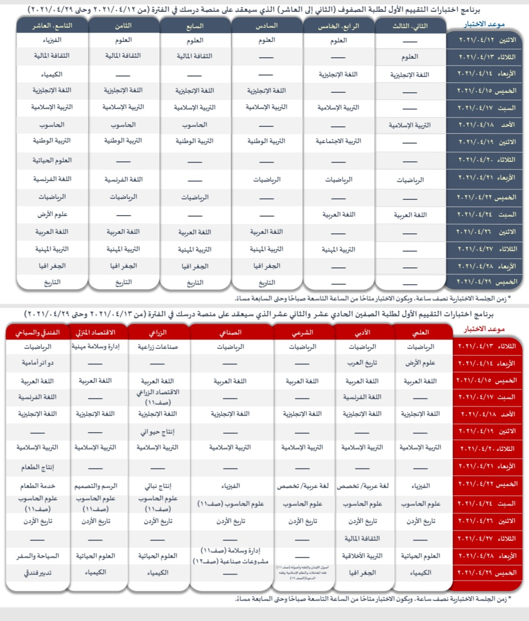 أحداث اليوم - أعلنت وزارة التربية والتعليم برنامج اختبارات التقييم الأول (الفصل الدراسي الثاني) لطلبة المدارس الحكومية وطلبة مدارس وزارة الأوقاف ومدارس الثقافة العسكرية للصفوف من الثاني الأساسي ولغاية الثاني عشر.