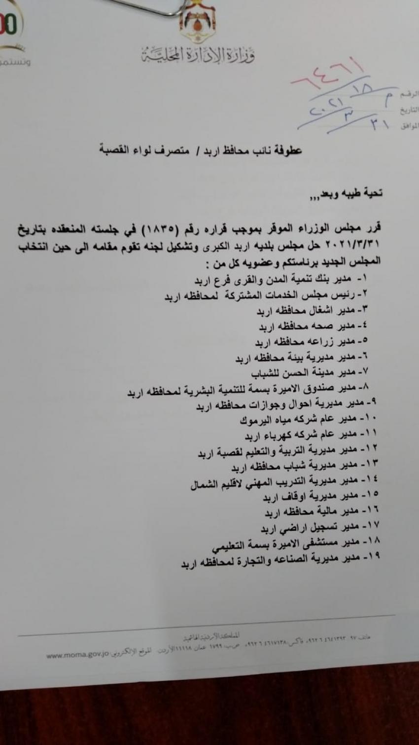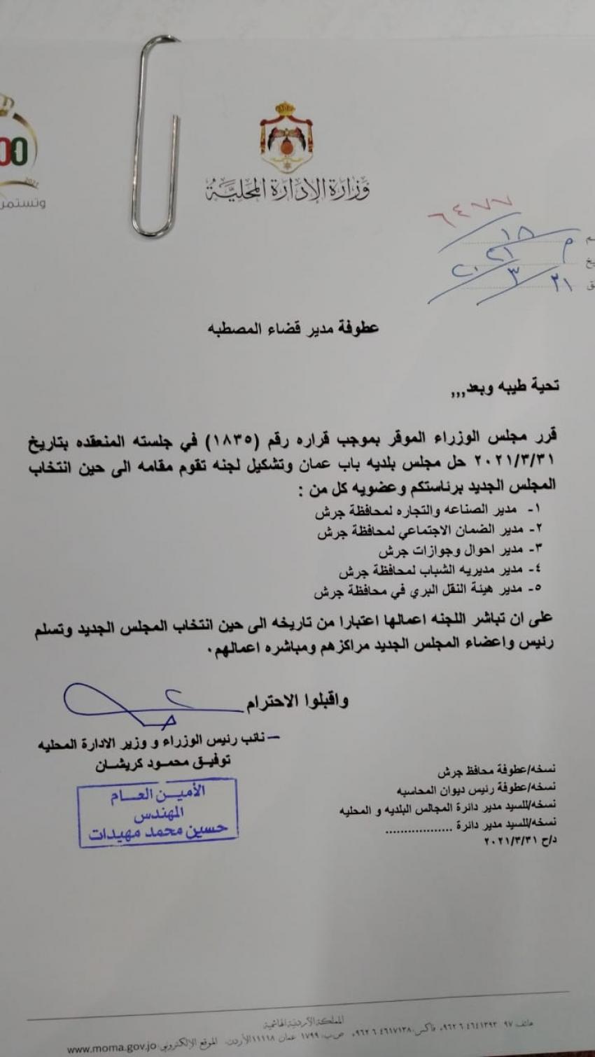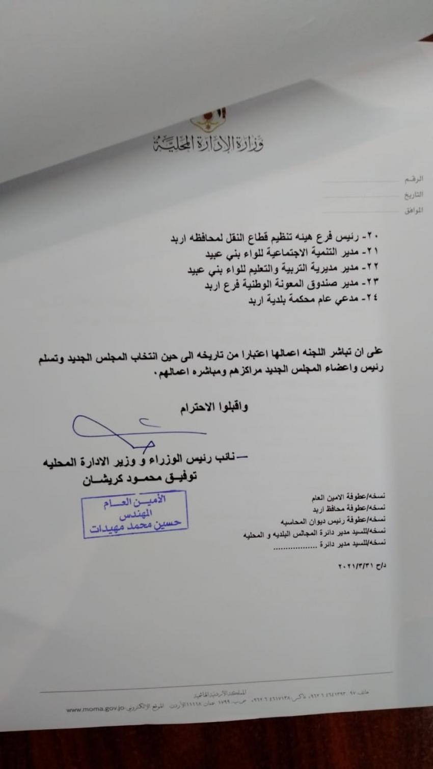 أحداث اليوم - قررت وزارة الادارة المحلية الأربعاء، تكليف لجان مؤقتة لادارة بلديات في محافظة جرش، وإربد.وتالياً الأسماء:
