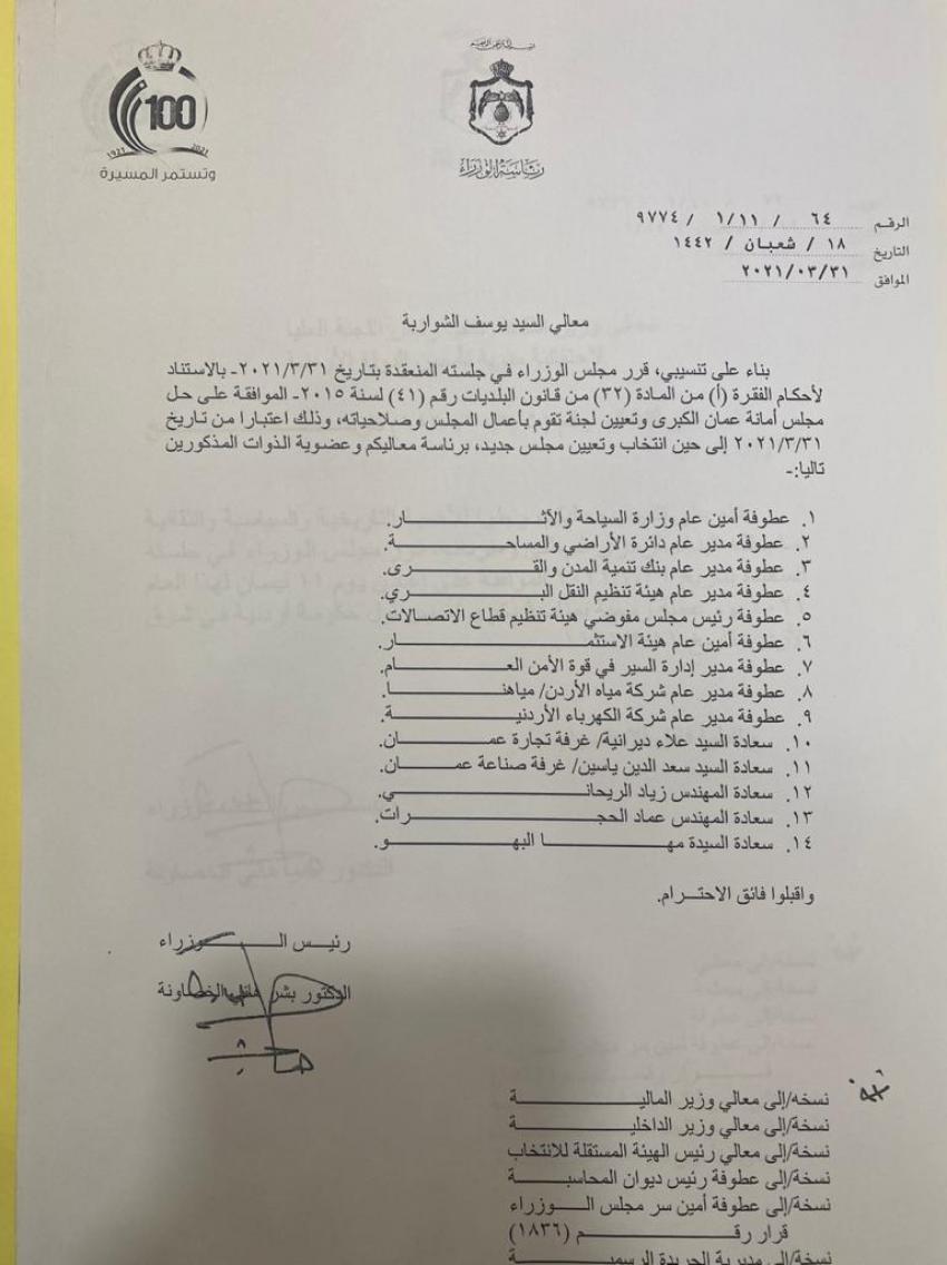 أحداث اليوم - شكل رئيس الوزراء الدكتور بشر الخصاونة الأربعاء، لجنة مؤقتة لادارة أمانة عمان برئاسة أمين عمان يوسف الشواربة.وتالياً الأسماء: