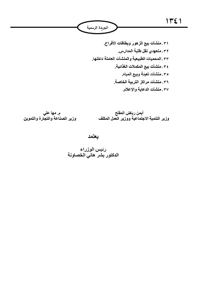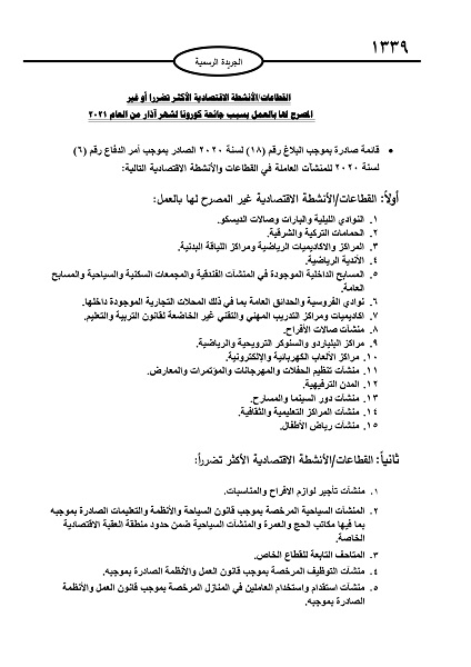 أحداث اليوم - نشرت الحكومة في عدد الجريدة الرسمية الصادر عنها اليوم الخميس، قائمة القطاعات الأكثر تضررا من الجائحة أو غير المصرح لها لشهر آذار.وتاليا قائمة أسماء القطاعات