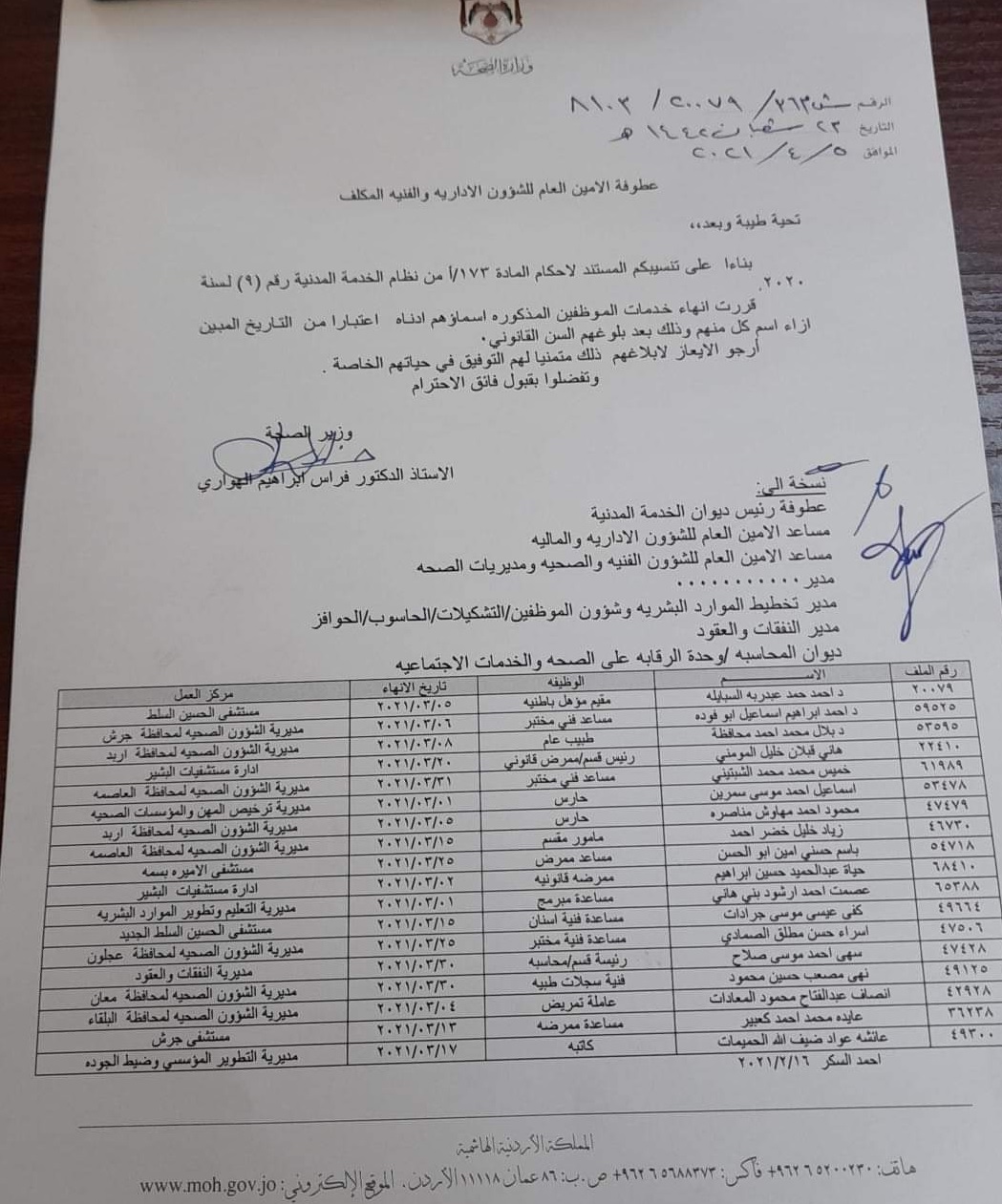 أحداث اليوم - قرر وزير الصحة الدكتور فراس الهواري، انهاء خدمات 18 موظفا بناء على تنسيب الأمين العام للشؤون الإدارية والفنية المكلف محمود زريقات.
