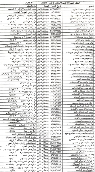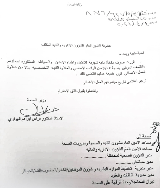 أحداث اليوم - قرر وزير الصحة الدكتور فراس الهواري صرف مكافآة مالية شهرية بنسبة 35% من الراتب الأساسي والعلاوة الفنية لأطباء وأطباء أسنان وصيادلة بدلا من علاوة العمل الإضافي.وتاليا الأسماء: