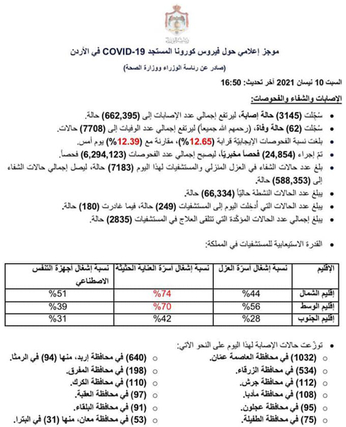 أحداث اليوم - سُجّلت في الأردن 62 وفاة بين المصابين بفيروس كورونا المستجد ، و3145 إصابة جديدة. وقالت وزارة الصحة انه بذلك ارتفع إجمالي عدد الإصابات منذ بدء الجائحة إلى 662395 إصابة.