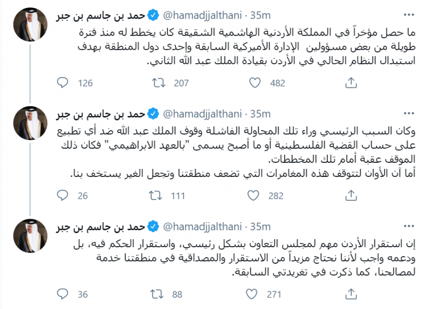 أحداث اليوم - قال رئيس الوزراء ووزير الخارجية السابق في دولة قطر حمد بن جاسم بن جبر، إن ما حصل مؤخراً في الأردن كان يخطط له منذ فترة طويلة من بعض مسؤولين الإدارة الأميركية السابقة وإحدى دول المنطقة بهدف استبدال النظام الحالي في الأردن بقيادة الملك عبدالله الثاني.