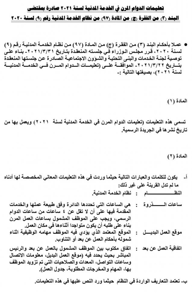 أحداث اليوم - أقر مجلس الوزراء، تعليمات الدوام المرن في الخدمة المدنية لسنة 2021، وفق ما نشر في الجريدة الرسمية الصادر اليوم الخميس.