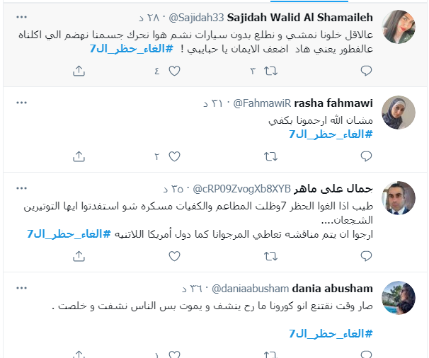 بينما ذهب مغردين إلى سرد الآثار السلبية الكبيرة للحظر اليومي على الصحة وما يخلقه من تداعيات نفسية كبيرة، مطالبين بضرورة السماح لهم بالتجول سيرا على الاقدام.