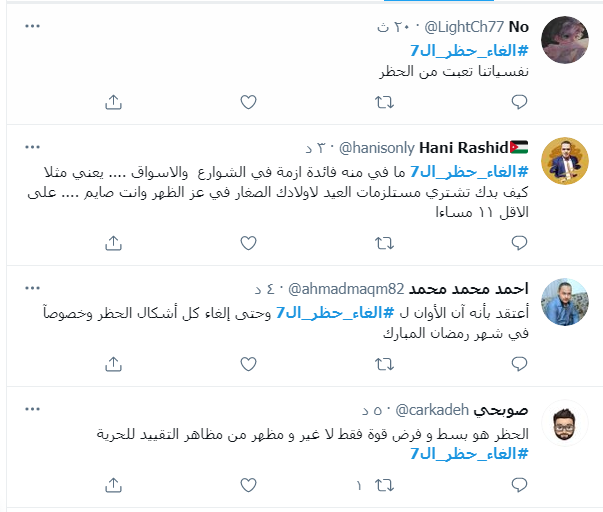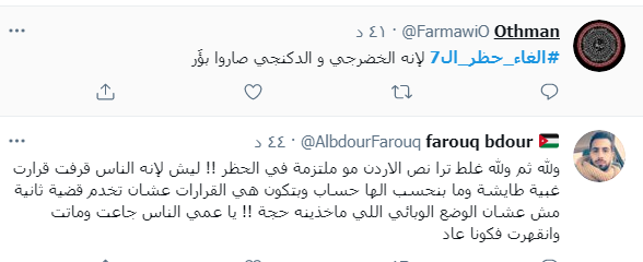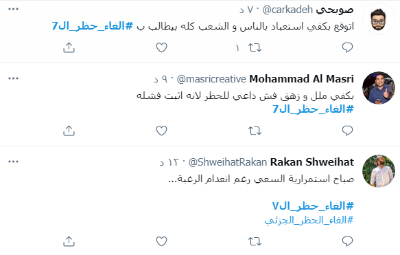 المغردون أكدوا، في تدويناتهم، أن حظر الساعة السابعة مساء القى بظلاله على الأردنيين، ما تسبب بآثار سلبية وخيمة على الاقتصاد الأردني الذي يعاني بالأساس من تداعيات جائحة كورونا.