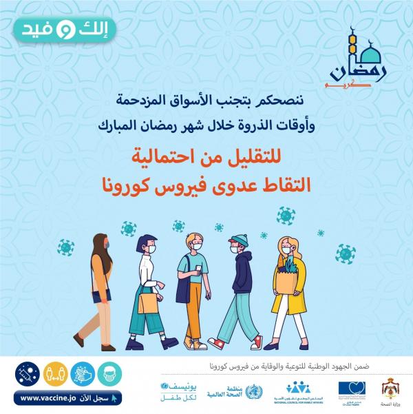 وقالت الوزارة في منشور لها عبر فيسبوك، إن تجنب الأسواق المزدحمة وأوقات الذروة خلال شهر رمضان يقلل من احتمالية التقاط عدوى فيروس كورونا.