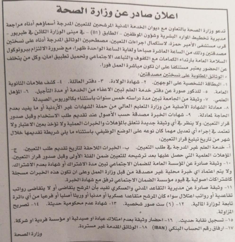 ودعت الوزارة المرشحين إلى ضرورة مراجعة مديرية تخطيط الموارد البشرية وشؤون الموظفين في مبنى الوزارة الكائن في طبربور قرب مستشفى الأمير حمزة بالعاصمة؛ وذلك لاستكمال إجراءات التعيين، مصطحبين الوثائق المدرجة أدناه على نسختين مصدقتين؛ وذلك من الساعة العاشرة صباحا وحتى الساعة الواحدة ظهرا.