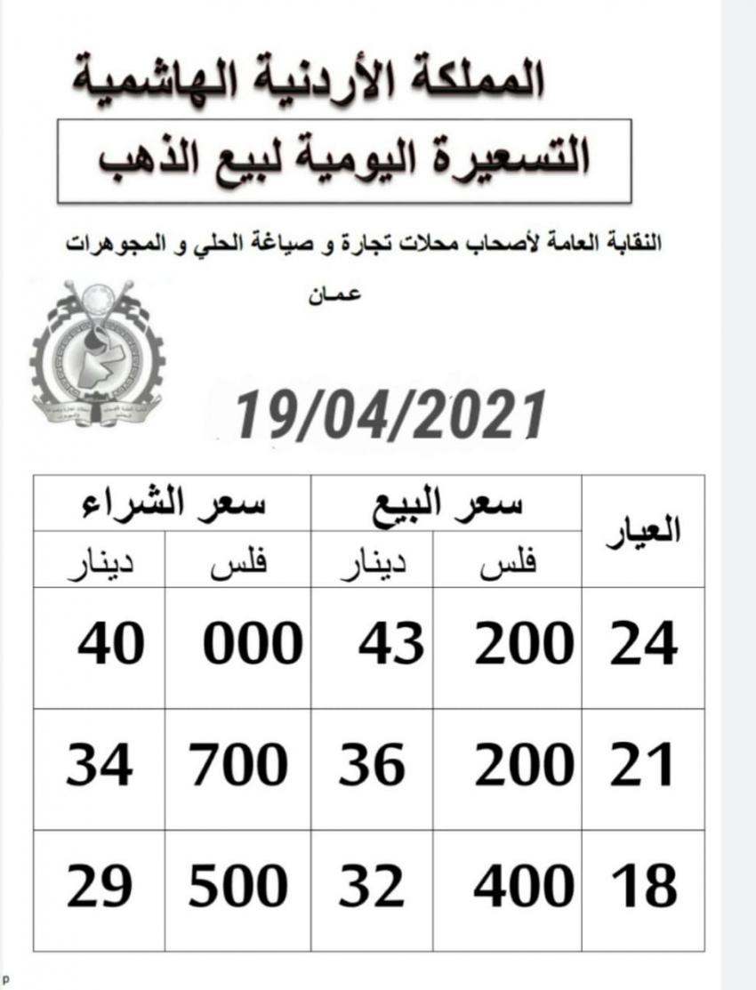 وبحسب التسعيرة اليومية لأصحاب محلات تجارة وصياغة الحلي والمجوهرات، بلغ سعر بيع الغرام من الذهب عياري 24 و18 لغايات الشراء من محلات الصاغة عند 43.20 و32.40 دينارا على التوالي.
