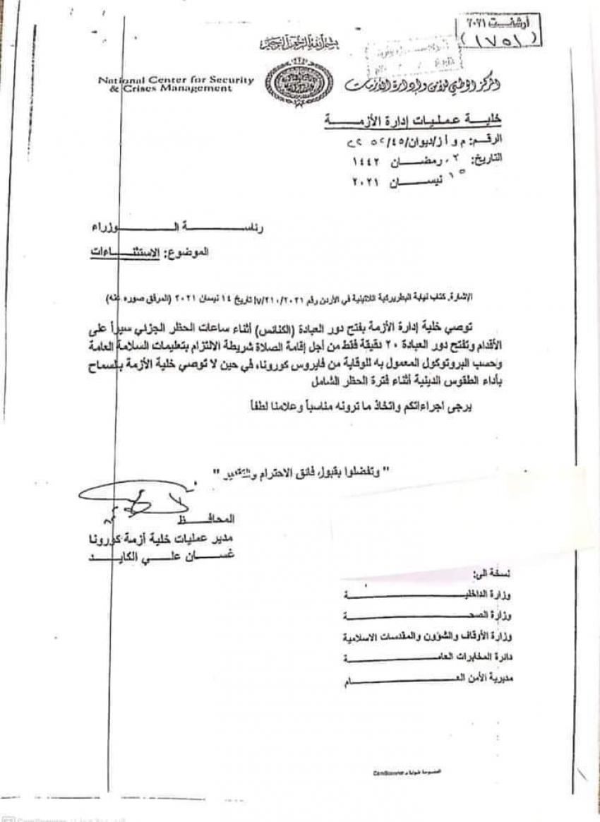 وقالت الخلية في توصيتها إن دور العبادة ستفتح لمدة 20 دقيقة فقط من اجل اقامة الصلاة شريطة الالتزام بتعليمات السلامة العامة والبروتوكول المعمول به للوقاية من فيروس كورونا.