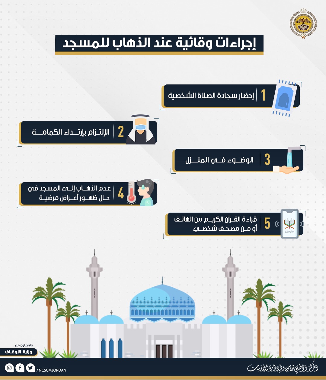 أحداث اليوم - نشر المركز الوطني للأمن وإدارة الأزمات الإجراءات الوقائية الواجب اتخاذها عند الذهاب إلى المسجد.