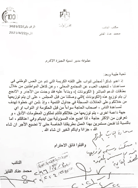 يذكر أنه قد تم توزيع 150 قسيمة شرائية على كل نائب لتوزيعها على للأسر العفيفة في منطقته الانتخابية، وقيمة كل قسيمة 35 دينارا.