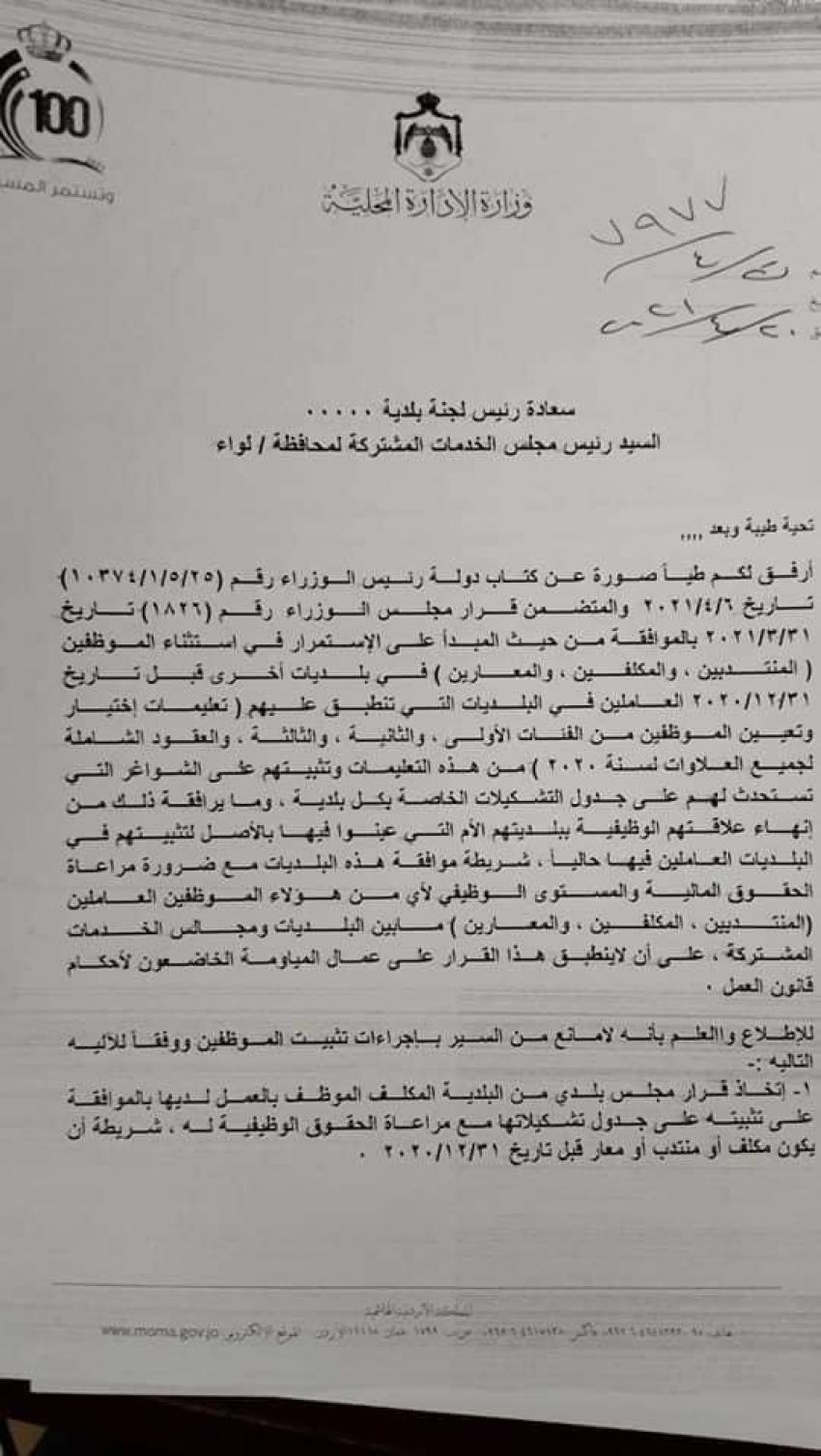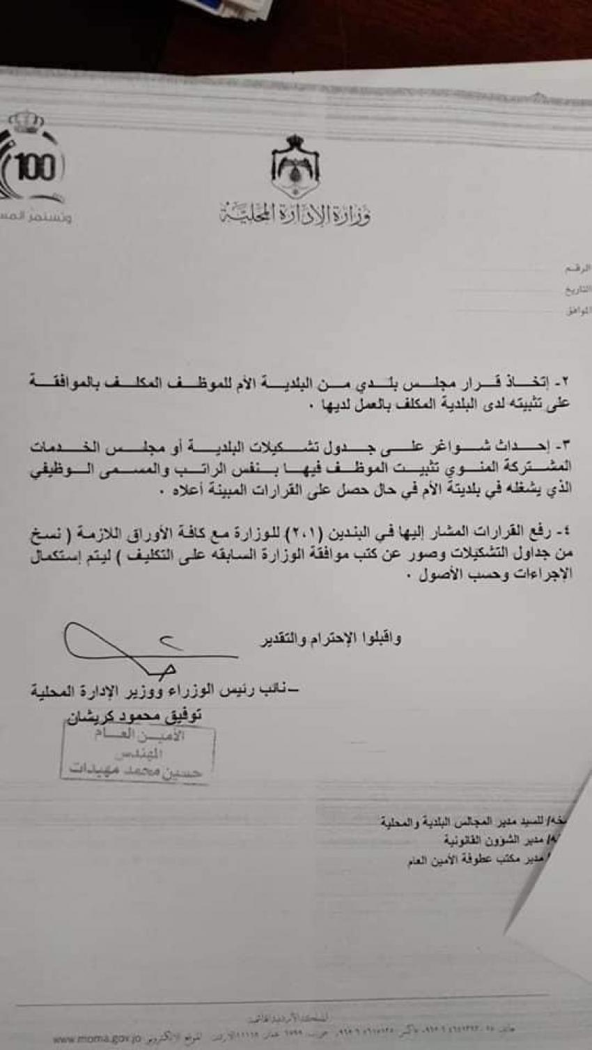 وقال كريشان في التعميم إن المكلف الموظف بالعمل لدي البلدية عليها اتخاذ قرار مجلس بلدي بالموفقة على تثبيته، وأن توافق البلدية الأم للموظف.