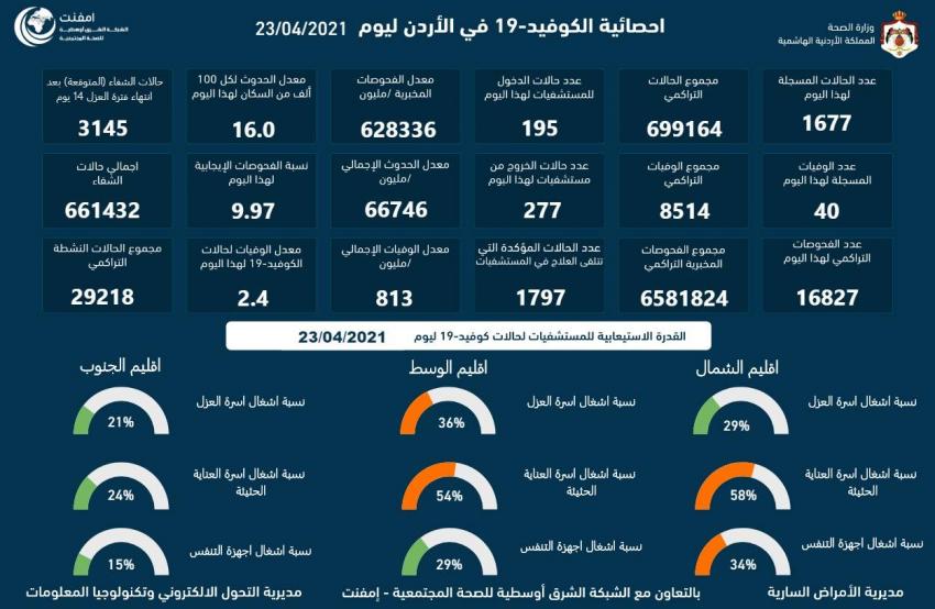 أحداث اليوم - قالت وزارة الصحة إن معدل الاصابات في الأردن يبلغ 66 ألفاً و746 اصابة لكل مليون، فيما يبلغ معدل الوفيات بسبب الفيروس 813 وفاة لكل مليون.