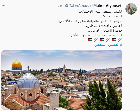 أحداث اليوم - تفاعل ناشطون عبر مواقع التواصل الاجتماعي، بشكل واسع مع وسم (هاشتاغ) "القدس تنتفض"، تزامنا مع المواجهات المتواصلة بين المقدسيين وقوات الاحتلال ومستوطنيه.