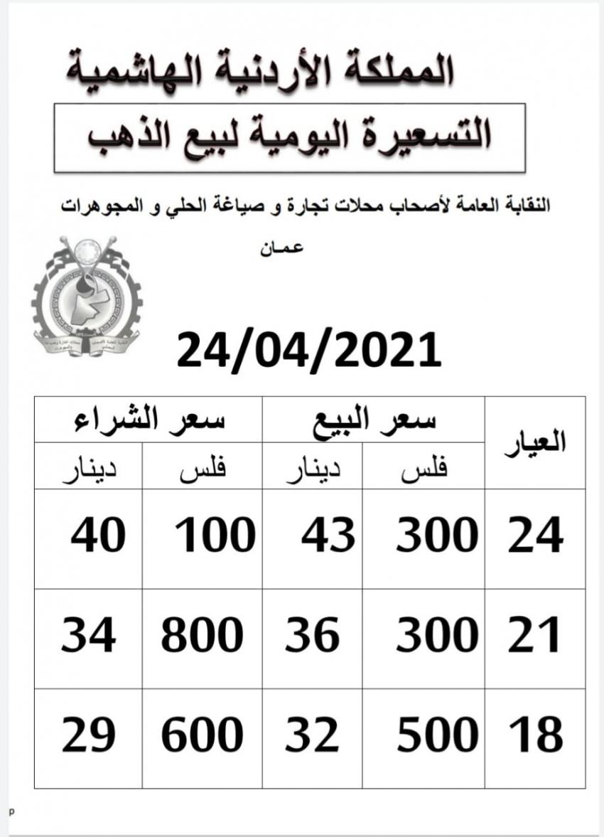 وبلغ سعر غرام الذهب عيار 21 في السوق المحلي السبت، 36.30 دينارا لغايات الشراء من محلات الصاغة، مقابل 34.80 دينارا لجهة البيع.