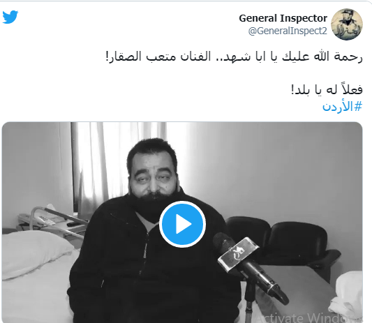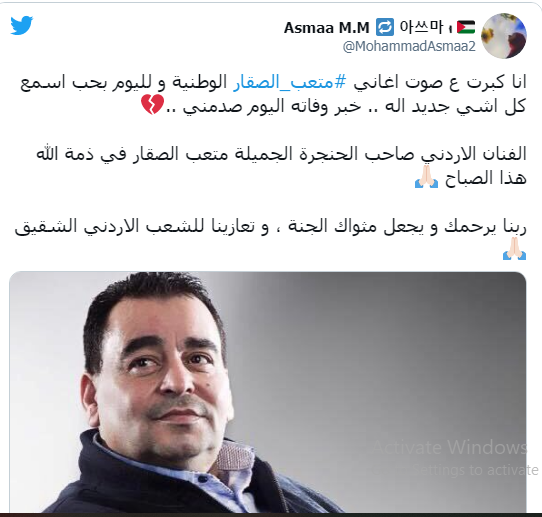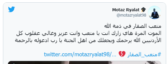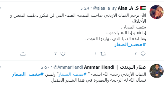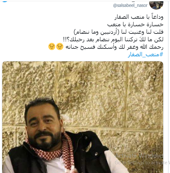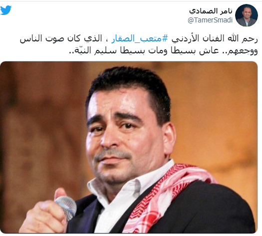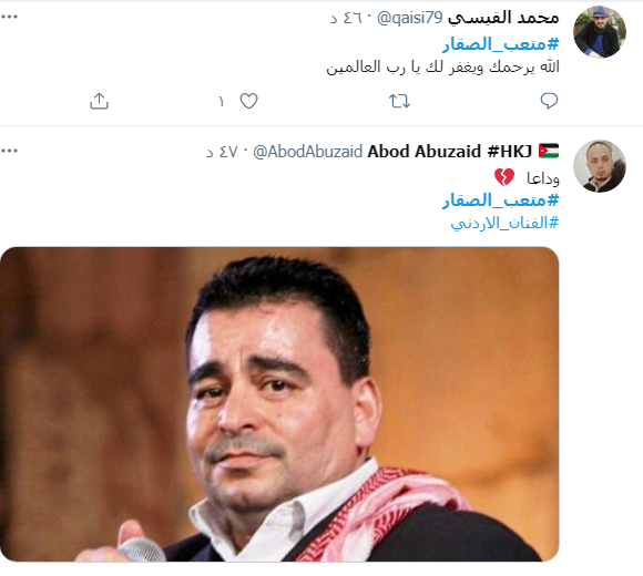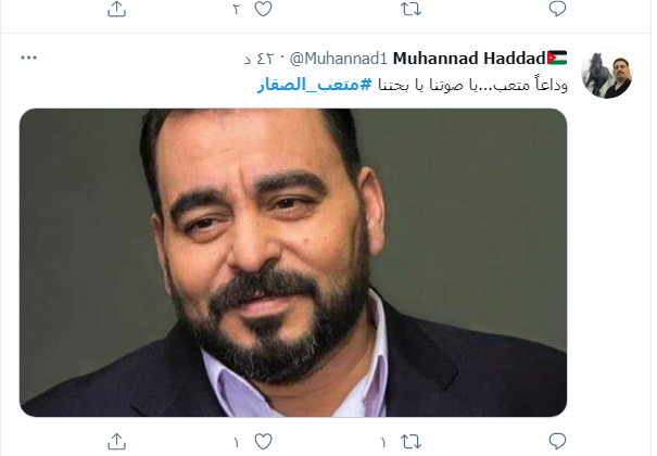 ودشن النشطاء وسم #متعب-الصقار ليتصدر قائمة الهاشتاق الاكثر تداولا، قائلين إنه ما زالت كلماته المليئة بحب الوطن واهازيجه التي تغنت بقمحنا وتراب اردننا تجول في الأذهان.