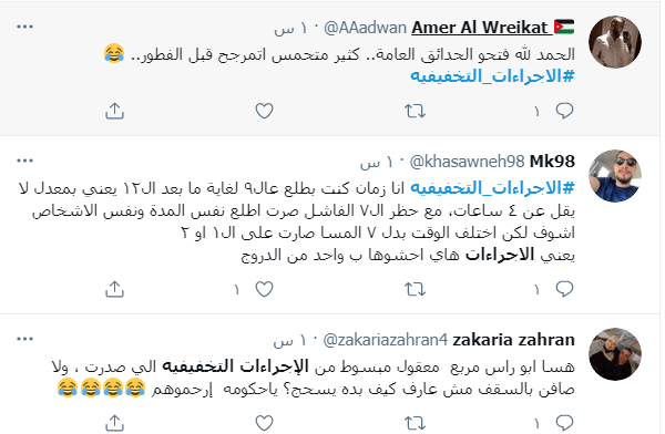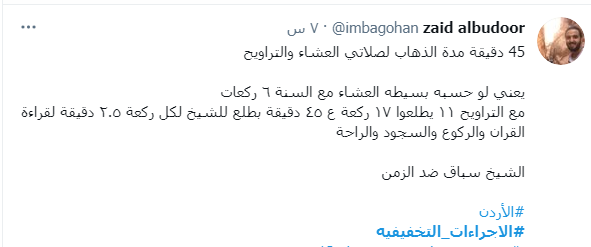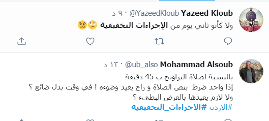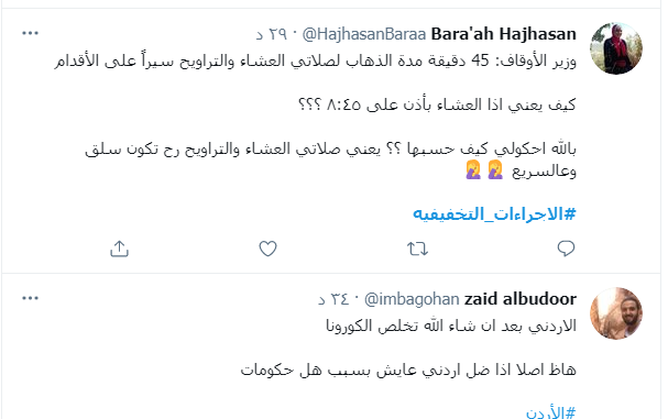 وقال النشطاء عبر وسم #الاجراءات_التخفيفية إن الحكومة لم تدرس القرار بشكل جيد، خاصة بعد أن حددت 45 دقيقة لصلاتي العشاء والتراويح، متسائلين كيف سيكون اقامة هذه السنة اذا لا يتوفر الوقت الكامل والكافي.