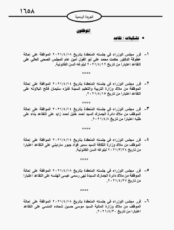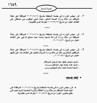 أحداث اليوم - قرر مجلس الوزراء إحالة موظفين في عدد من الوزارات والدوائر إلى التقاعد.وتاليا الاسماء: