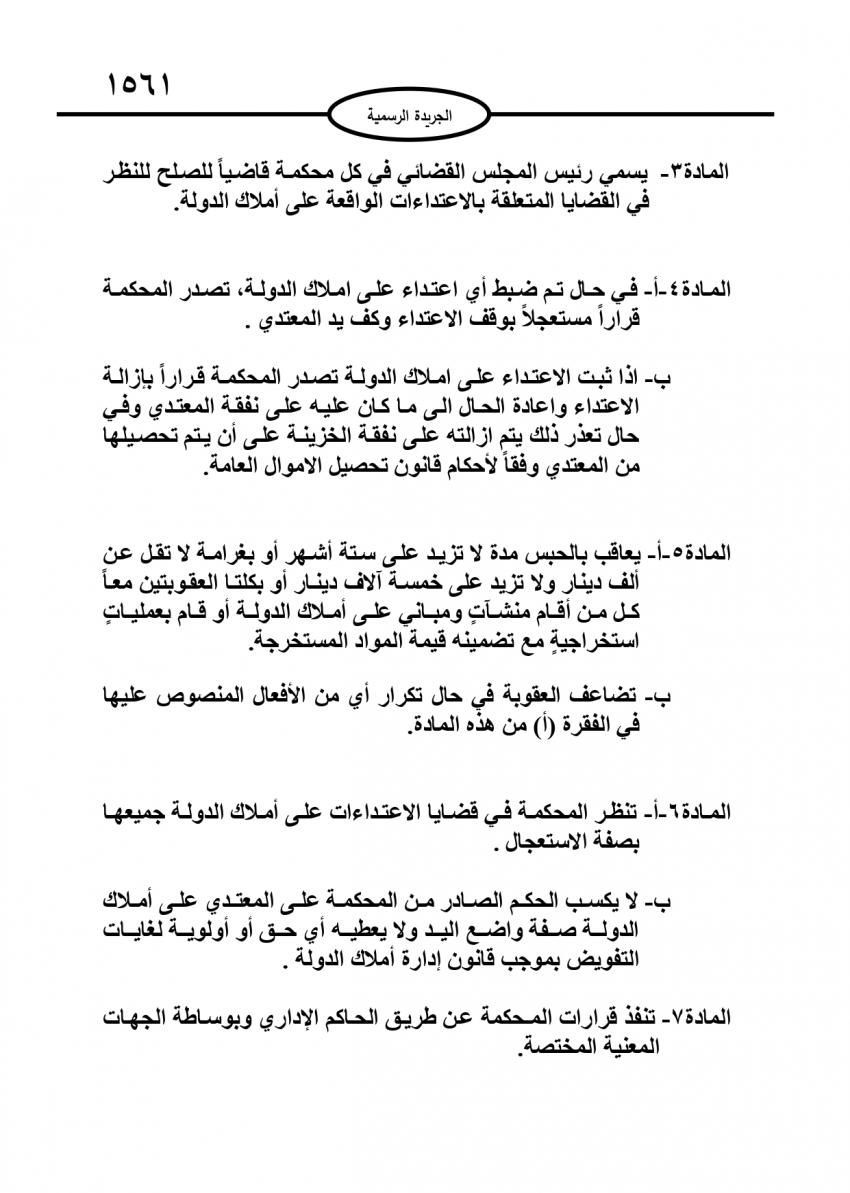 وحدد القانون عقوبات المعتدين على أملاك الدولة بالحبس مدة لا تزيد على ستة أشهر أو بغرامة لا تقل عن ألف دينار لكل من أقام منشآت ومبانٍ على أملاك الدولة.