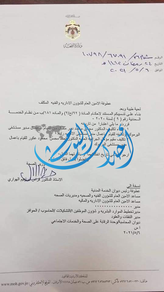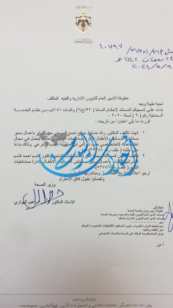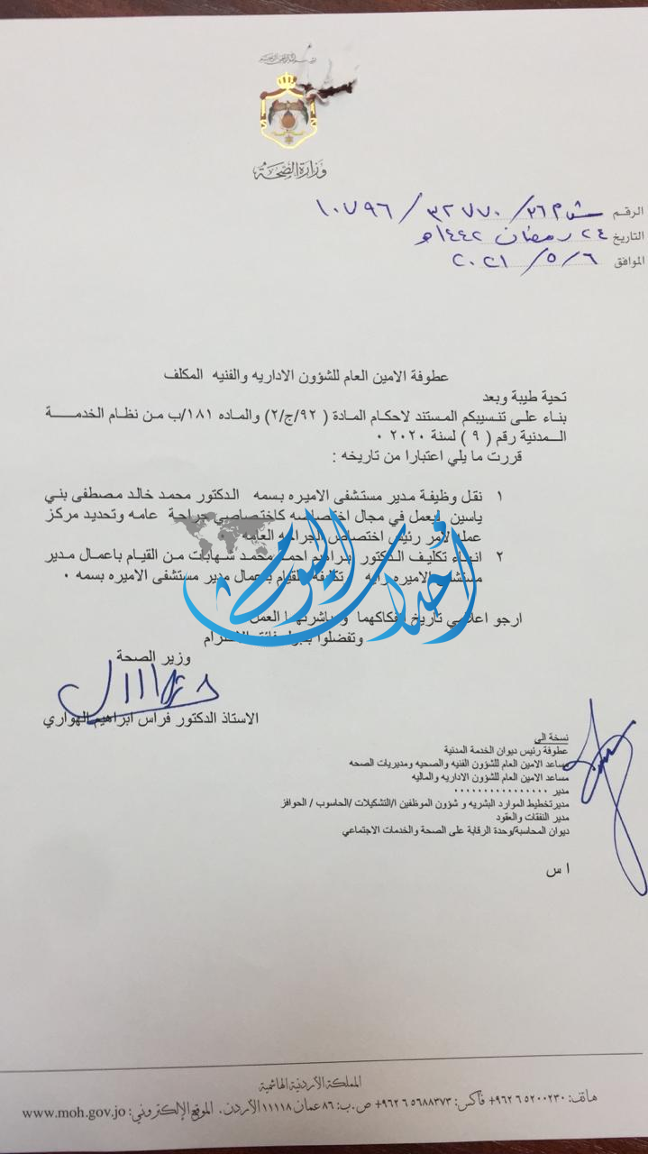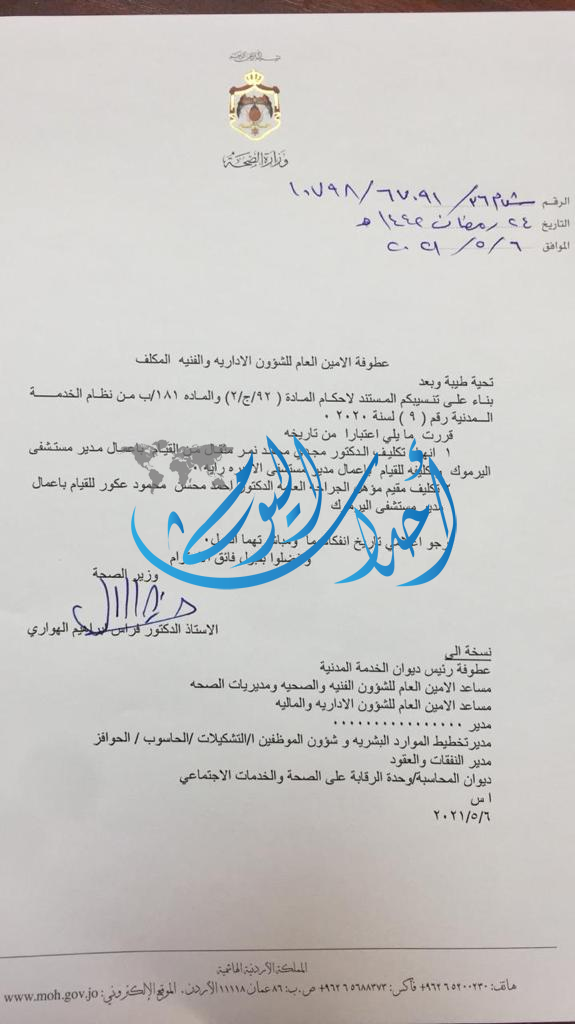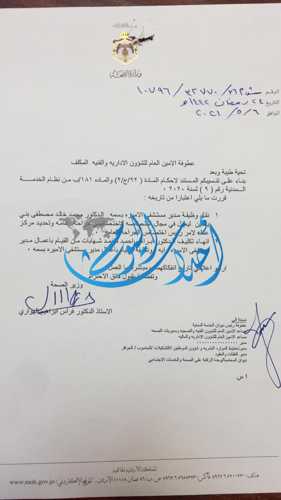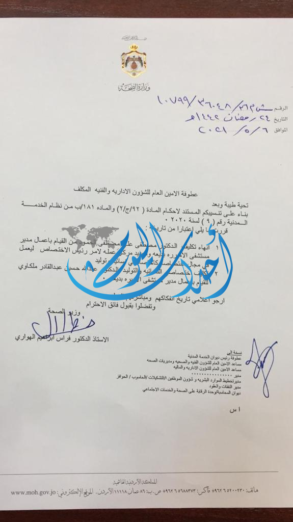 أحداث اليوم - ياسر شطناوي - قرر وزير الصحة الدكتور فراس الهواري إجراء تنقلات واسعة وانهاء تكليف شملت مدراء مستشفيات.