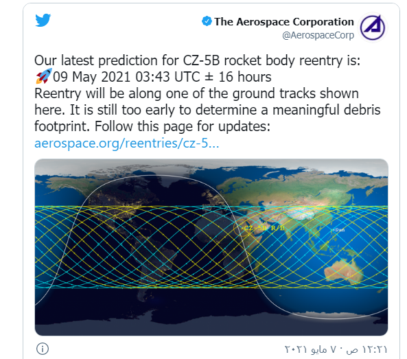 ونقل تقرير لصحيفة “نيويورك تايمز” الأميركية عن المنظمة غير الربحية التي تمولها الحكومة الأميركية، أن الصاروخ قد يدخل المجال الجوي للأرض السبت.