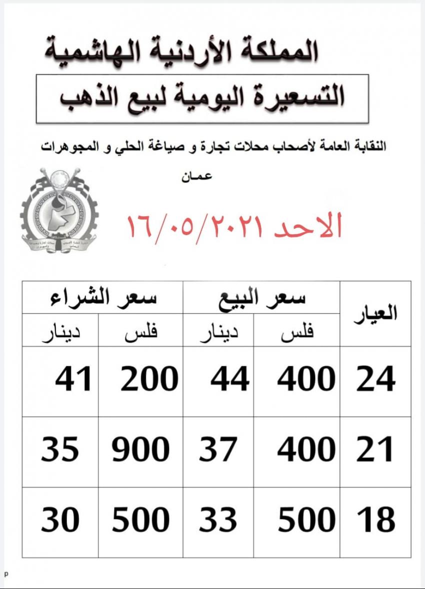 وبحسب التسعيرة اليومية للنقابة العامة لأصحاب محلات تجارة وصياغة الحلي والمجوهرات، بلغ سعر بيع الغرام من الذهب عياري 24 و18 لغايات الشراء من محلات الصاغة عند 44.40 و33.50 دينارا على التوالي.