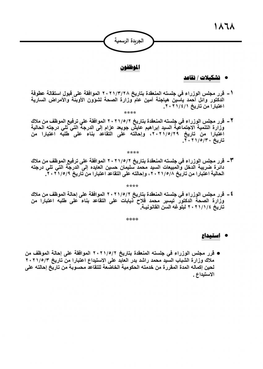 أحداث اليوم - صدر في عدد الجريدة الرسمية اليوم الأحد قرارات مجلس الوزراء باحالة عدد من موظفي الدولة الى التقاعد، وقبول استقالة اخرين.وتاليا الاسماء: