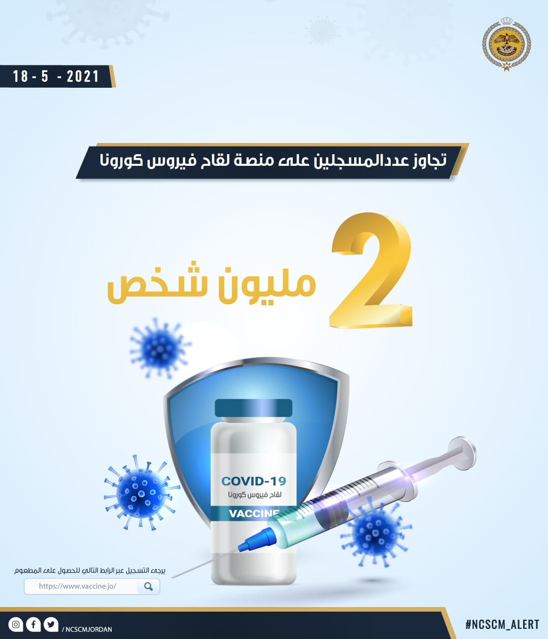 أحداث اليوم - قالت عمليات خلية الأزمة، في المركز الوطني للأمن وإدارة الأزمات انه قد تجاوز عدد المسجلين على منصة تلقي اللقاح المضاد لفايروس كورونا 2 مليون شخص.