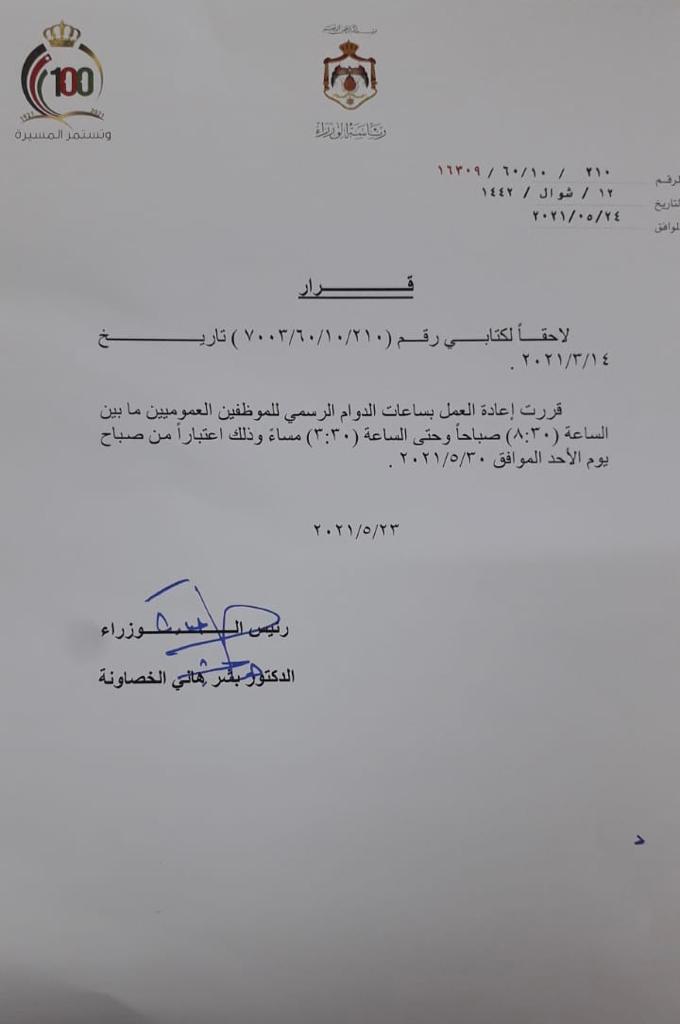 أحداث اليوم - قرر رئيس الوزراء الدكتور بشر الخصاونة، اعادة دوام الموظفين في المؤسسات الحكومية ليبدأ من الساعة 8:30 وحتى الساعة 3:30 عصراً.ويبدأ سريان هذا القرار الاحد المقبل الموافق 30 أيار الجاري.
