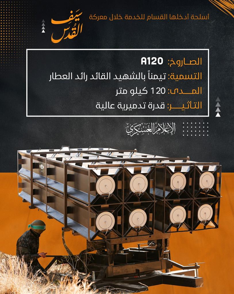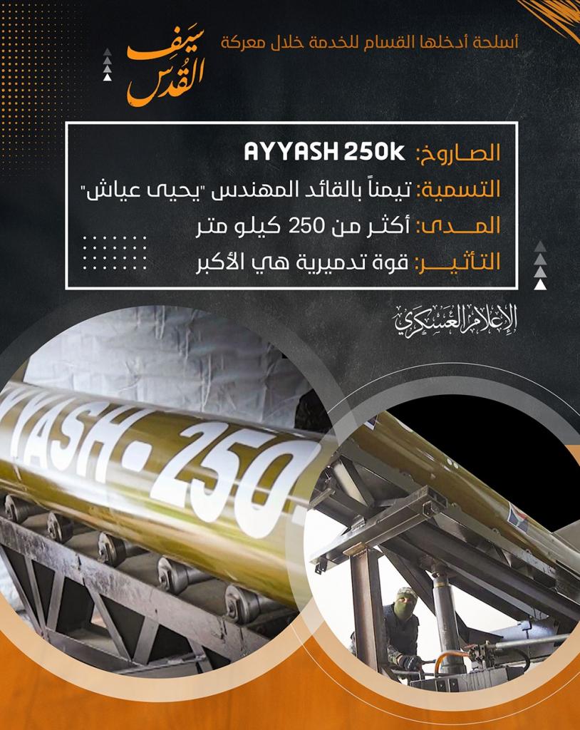 وقالت القسام بأن الأسلحة التي استخدمتها في الخدمة خلال معركة "سيف القدس"، صاروخ "عياش 250"، تيمنا بالشهيد القائد المهندس يحيى عياش. ومدى هذا الصاروخ أكثر من 250 كيلو مترا وتأثيره بقوة تدميرية كبيرة وتعتبر هي الأكبر.