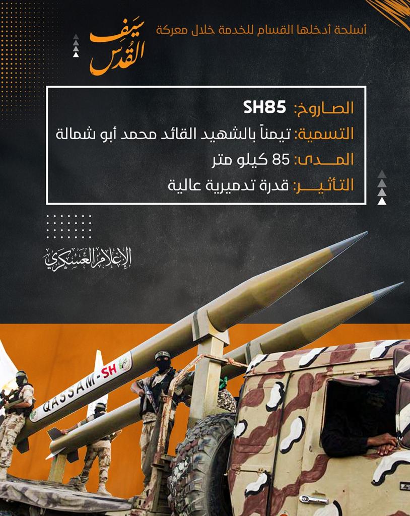 واستخدمت الكتائب صاروخ SH58 تيمنا بالشهيد القائد محمد أبو شمالية ومداه 85 كيلو مترا وقدرته التدميرية عالية.
