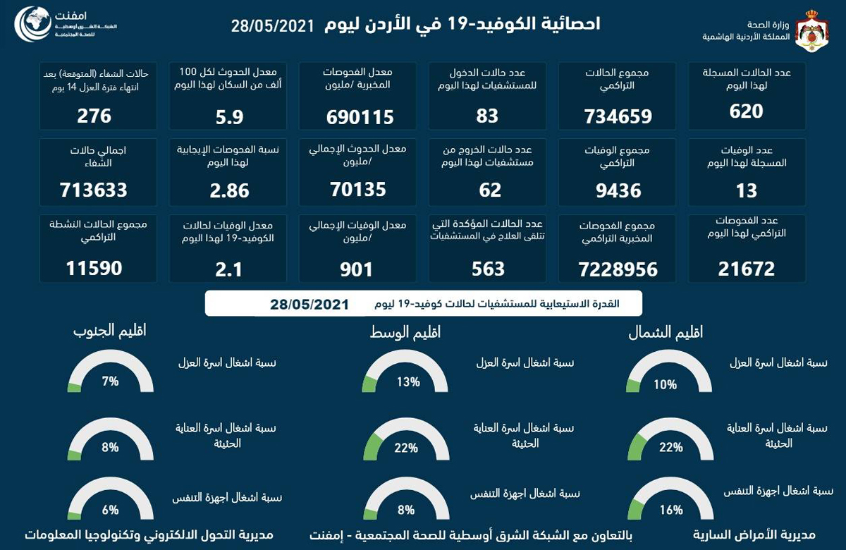 أحداث اليوم - اعلنت وزارة الصحة ، الجمعة ، تسجيل 13 وفاة و620 إصابة جديدة بفيروس كورونا في الساعات الـ 24 الماضية.وبلغت نسبة الفحوصات الإيجابية الأقل منذ أسابيع (2.86%).