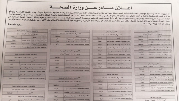 أحداث اليوم - دعت وزارة الصحة، اليوم الاثنين، وبالتنسيق مع ديوان الخدمة المدنية مرشحين في التمريض والمختبرات والتحاليل الطبية، لإجراء المقابلة الشخصية.