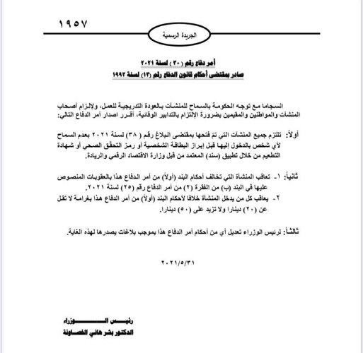 أحداث اليوم - أصدر رئيس الوزراء الدكتور بشر الخصاونة أمر الدّفاع رقم (30) لسنة 2021م، الذي يُلزِم جميع المنشآت التي تمّ فتحها بعدم السّماح لأيّ شخص بالدخول إليها قبل إبراز البطاقة الشخصيّة أو رمز التحقّق الصحّي أو شهادة التطعيم من خلال تطبيق (سند).