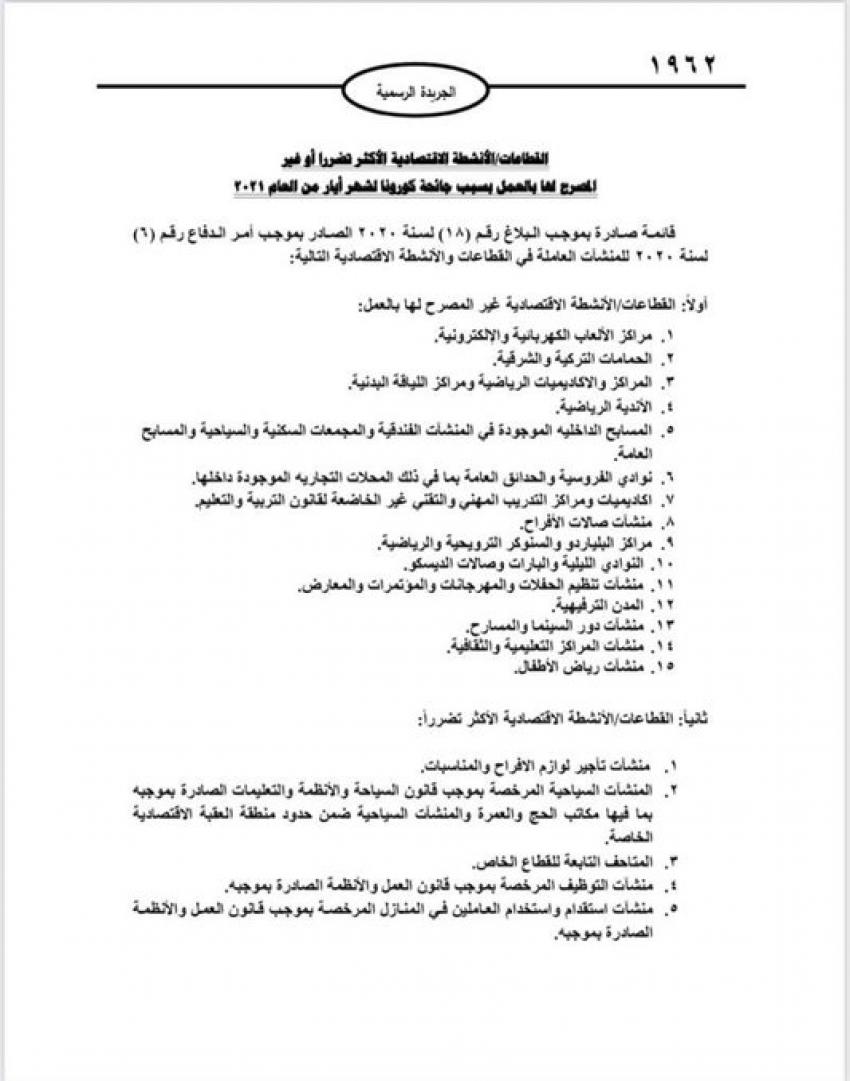 أحداث اليوم - نشرت رئاسة الوزراء، اليوم الثلاثاء، قائمة القطاعات والأنشطة الاقتصاديّة الأكثر تضرّراً وغير المصرّح لها بالعمل بسبب جائحة كورونا لشهر أيّار 2021.