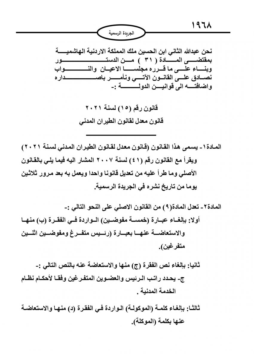 أحداث اليوم - صدرت الارادة الملكية السامية الثلاثاء، بالموافقة على القانون المعدل لقانون الطيران المدني لسنة 2021.