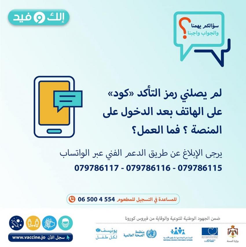 أحداث اليوم - دعت وزارة الصحة المواطنين الذي لم يصلهم رمز تأكيد على هاتفهم بعد الدخول إلى منصة التطعيم ابلاغ أرقام الدعم الفني عبر تطبيق واتساب.