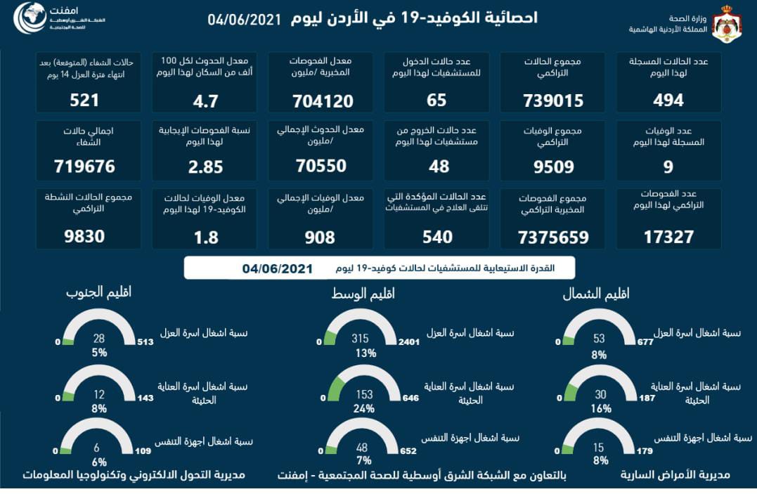 أحداث اليوم - أعلنت وزارة الصحة الجمعة، عن تسجيل 9 وفيات و494 اصابة كورونا جديدة في الأردن.