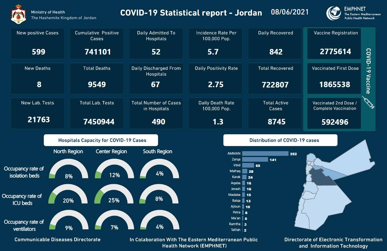 8 وفيّات و599 إصابة جديدة بكورونا بالأردن