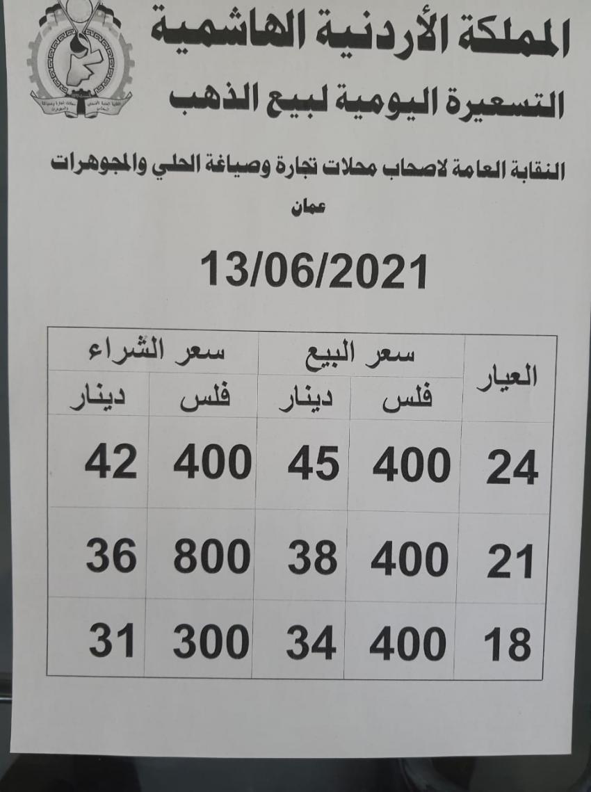 كما بلغ سعر بيع الغرام من الذهب عياري 24 و18 لغايات الشراء من محلات الصاغة عند 45.4 و34.4 دينارا على التوالي.