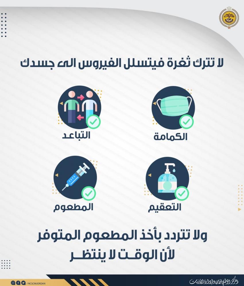 أحداث اليوم - دعا المركز الوطني للأمن وإدارة الأزمات الأردنيين إلى الالتزام باجراءات الوقاية من عدوى فيروس كورونا (الكمامة، التباعد الجسدي، التعقيم، وتلقي المطعوم).