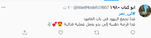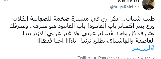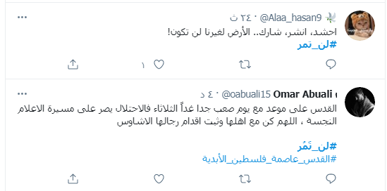 واطلق ناشطون الوسم مع دعوات للتصدي لمسيرة الاعلام التي يعتزم مستوطنون تنظيمها يوم غد الثلاثاء.