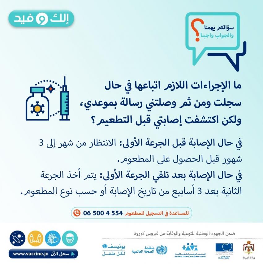 وردا على سؤال ما هي الاجراءات في حال التسجيل عبر منصة اللقاحات وتلقي موعد وقبل التطعيم اكتشفت اصابة الشخص بفيروس كورونا، قالت الوزارة إنه في حال اكتشاف الاصابة قبل الجرعة الاولى من اللقاح، فيجب الانتظار من شهر الى 3 اشهر قبل الحصول على المطعوم.